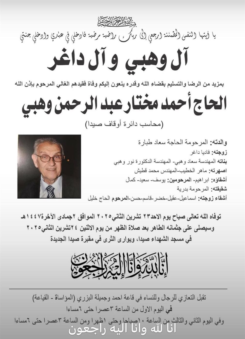 وفاة الحاج احمد مختار عبدالرحمن وهبي (محاسب دار اوقاف صيدا)، الدفن ظهر يوم الاثنين في 24 تشرين الثاني 2025 الأحد 23/تشرين الثاني/2025 - 02:46 م 11/23/2025 2:46:49 PM شارك