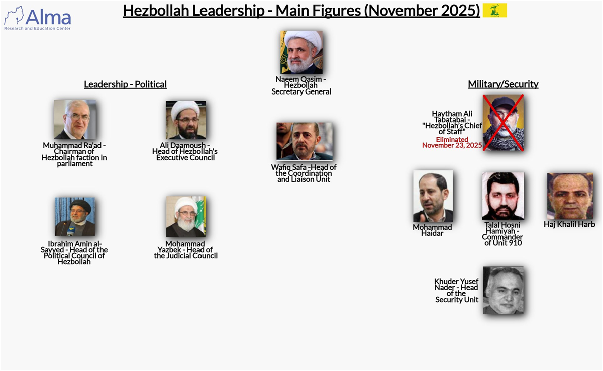 نشر معهد "ألما" الإسرائيلي للدراسات الأمنية، خارطة تظهر صور قادة ومسؤولي "حزب الله" لاسيما على صعيد الجناحين السياسي والعسكري.