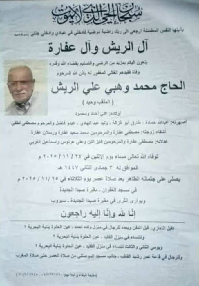 وفاة الحاج محمد وهبي علي الريش، الدفن عصر يوم الثلاثاء في 25 تشرين الثاني 2025 الثلاثاء 25/تشرين الثاني/2025 - 11:28 ص 11/25/2025 11:28:51 AM شارك