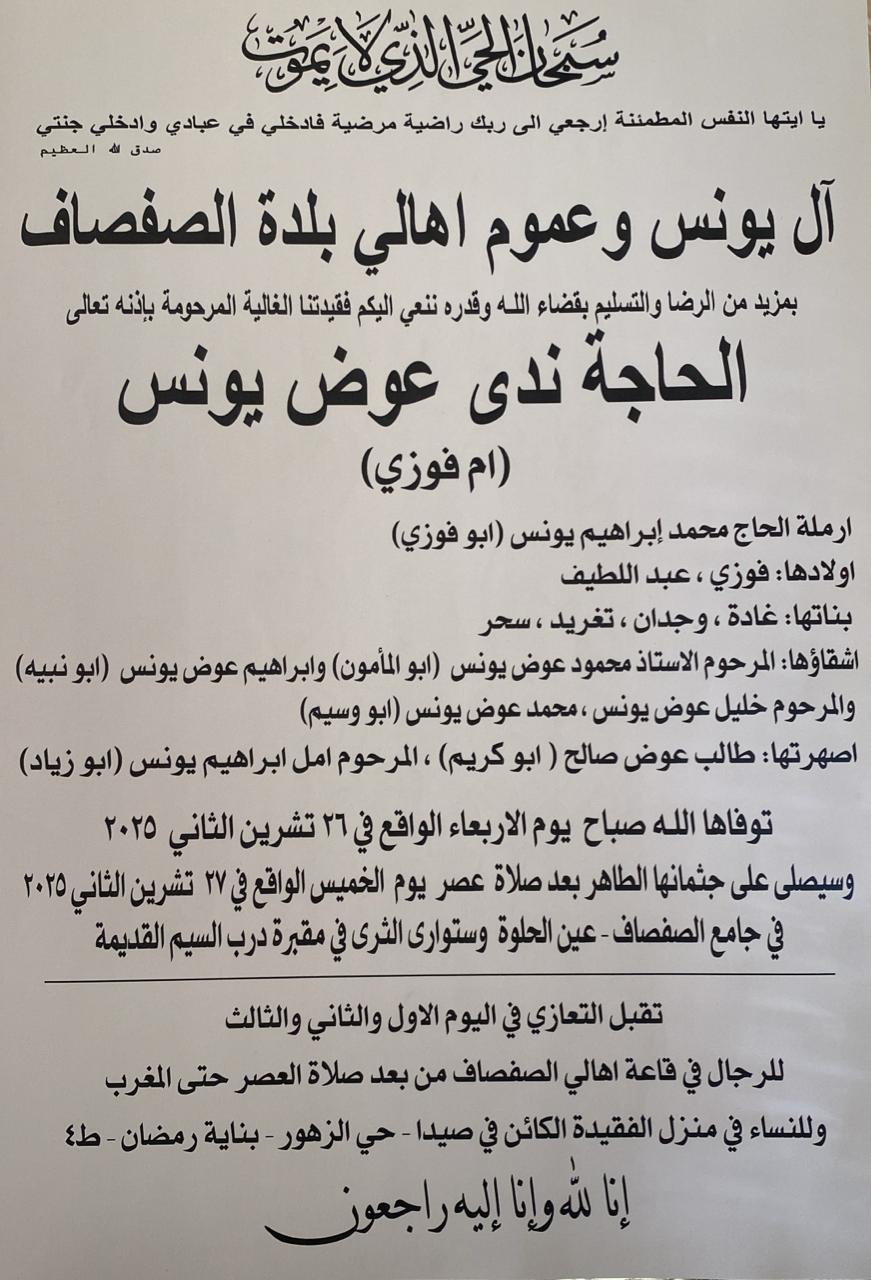 وفاة الحاجة ندى عوض يونس (ام فوزي)، الدفن عصر يوم الخميس في 27 تشرين الثاني 2025 الأربعاء 26/تشرين الثاني/2025 - 07:04 م 11/26/2025 7:04:48 PM شارك