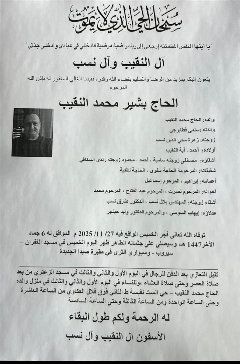 وفاة الحاج بشير محمد النقيب، الدفن ظهر يوم الخميس في 27 تشرين الثاني 2025 الخميس 27/تشرين الثاني/2025 - 10:00 ص 11/27/2025 10:00:18 AM شارك