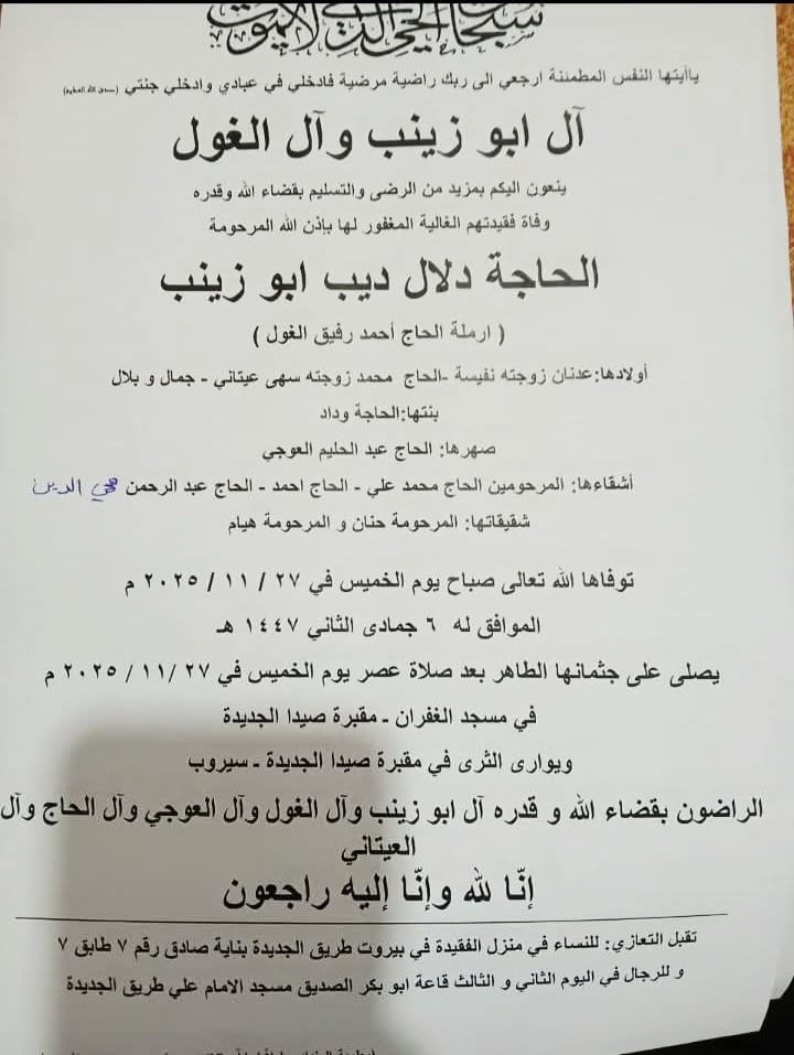 وفاة الحاجة دلال ديب ابو زينب، الدفن عصر يوم الخميس في 27 تشرين الثاني 2025 الخميس 27/تشرين الثاني/2025 - 10:48 ص 11/27/2025 10:48:07 AM شارك