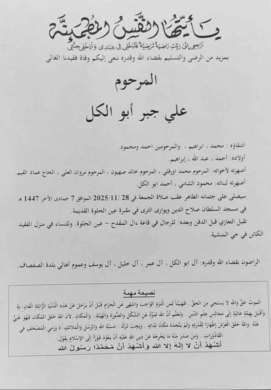وفاة علي جبر ابو الكل، الدفن ظهر يوم الجمعة في 28 تشرين الثاني 2025 الجمعة 28/تشرين الثاني/2025 - 09:57 ص 11/28/2025 9:57:28 AM شارك