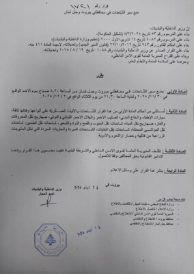 أصدر وزير الداخلية والبلديات أحمد الحجار قراراً بمنع سير الشاحنات في محافظتي بيروت وجبل لبنان اعتباراً من الساعة 8:30 صباح يوم الأحد في 30/11/2025 ولغاية الساعة 21:30 من يوم الثلاثاء في 2/12/2025، بمناسبة زيارة البابا لاوون الرابع عشر.