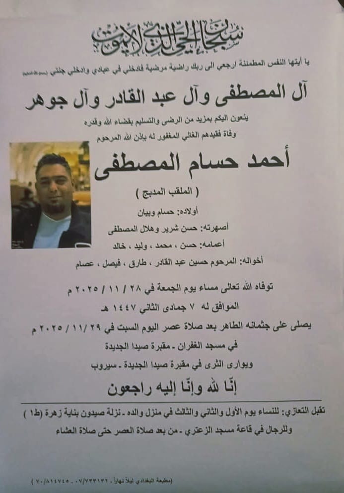 وفاة احمد حسام مصطفى الملقب (المدبج)، الدفن عصر يوم السبت في 29 تشرين الثاني 2025 السبت 29/تشرين الثاني/2025 - 11:07 ص 11/29/2025 11:07:12 AM شارك