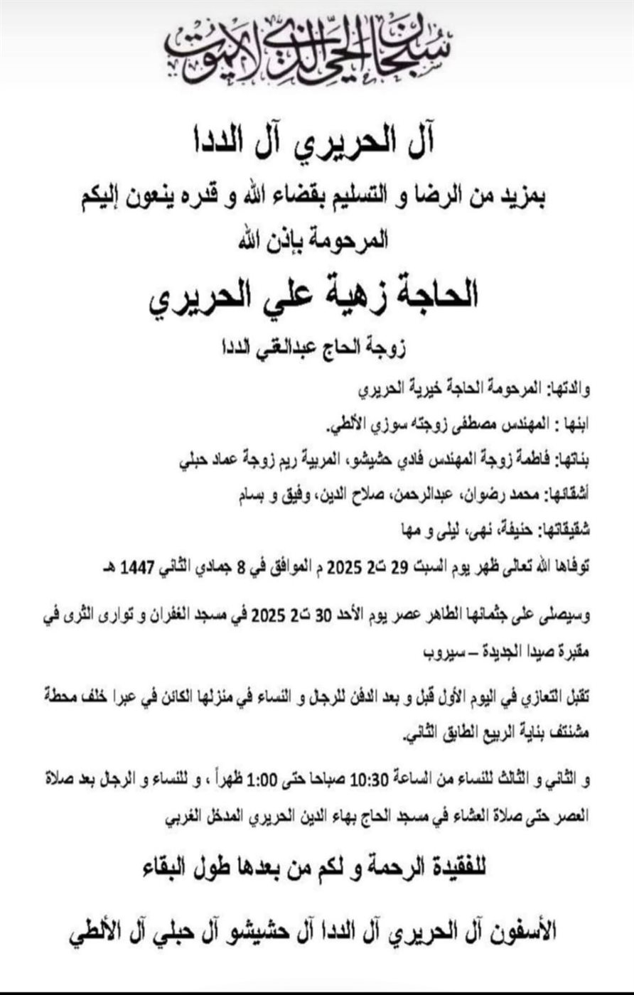وفاة الحاجة زهية علي الحريري، الدفن عصر يوم الاحد في 30تشرين الثاني 2025 الأحد 30/تشرين الثاني/2025 - 09:54 ص 11/30/2025 9:54:50 AM شارك