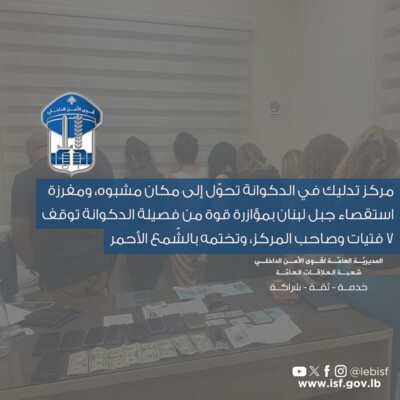 ولفت البيان الى انه بتاريخ 20-11-2025، وبنتيجة استقصاءات وتحريات مكثفة أجراها عناصر المكتب، توجهت دورية إلى المكان بمؤازرة قوة من فصيلة الدكوانة، وتمكّنت من القبض على /7/ فتيات من جنسيات مختلفة، بالإضافة إلى صاحب المركز والناطور. وتم ختم المركز بالشمع الأحمر، وأجري المقتضى القانوني بحق الموقوفين بناءً على إشارة القضاء المختص.