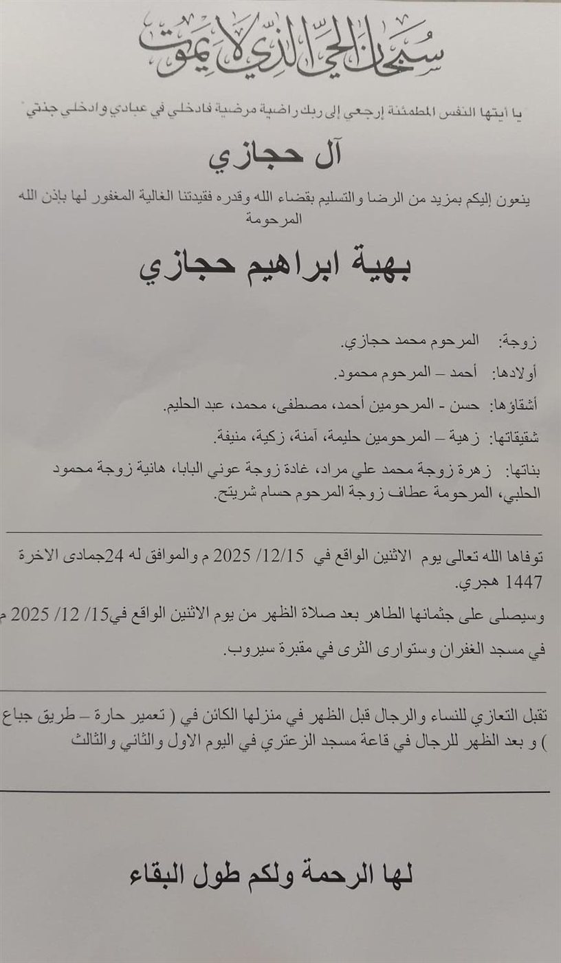 وفاة بهية ابراهيم حجازي، الدفن ظهر يوم الاثنين في 15 كانون الاول 2025 الإثنين 15/كانون الأول/2025 - 11:21 ص 12/15/2025 11:21:10 AM شارك