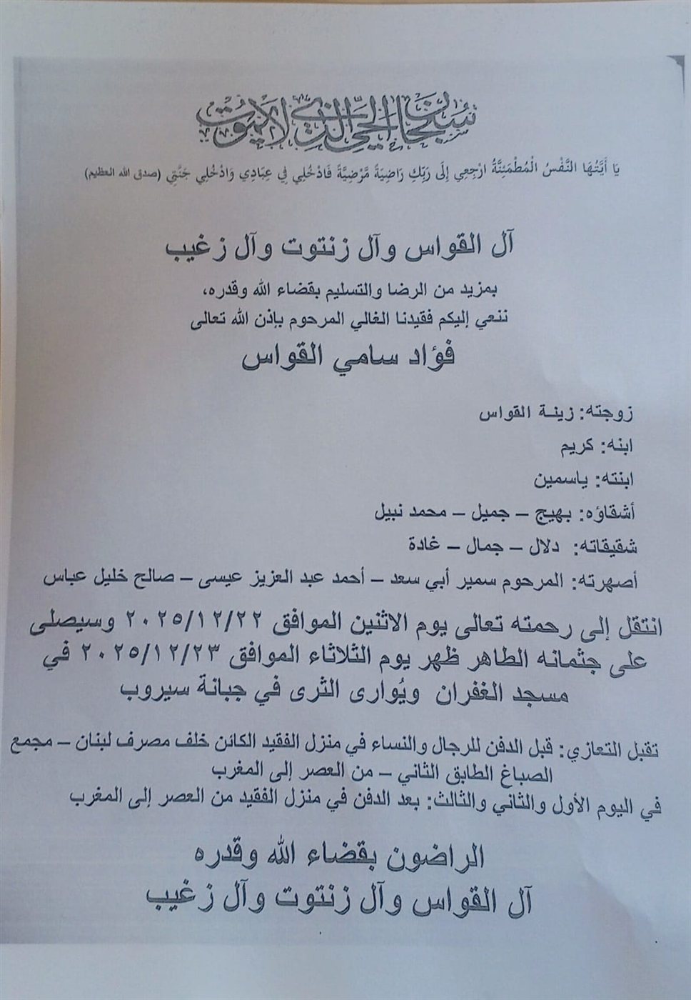 وفاة فؤاد سامي القواص، الدفن ظهر يوم الثلاثاء في 23 كانون الاول 2025 الإثنين 22/كانون الأول/2025 - 09:17 م 12/22/2025 9:17:54 PM شارك