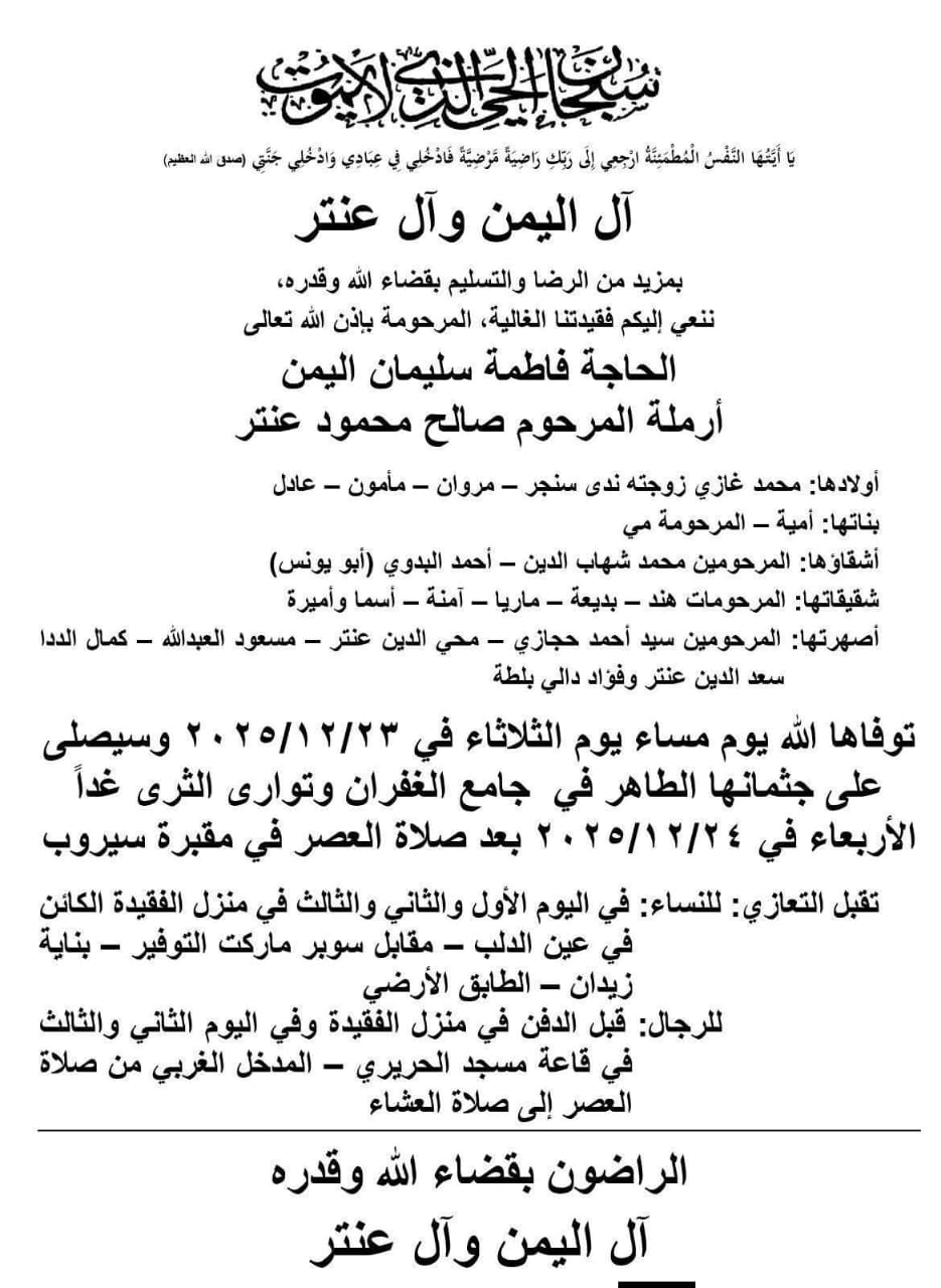 وفاة الحاجة فاطمة سليمان اليمن، الدفن عصر يوم الاربعاء في 24 كانون الاول 2025 الثلاثاء 23/كانون الأول/2025 - 10:46 م 12/23/2025 10:46:43 PM شارك