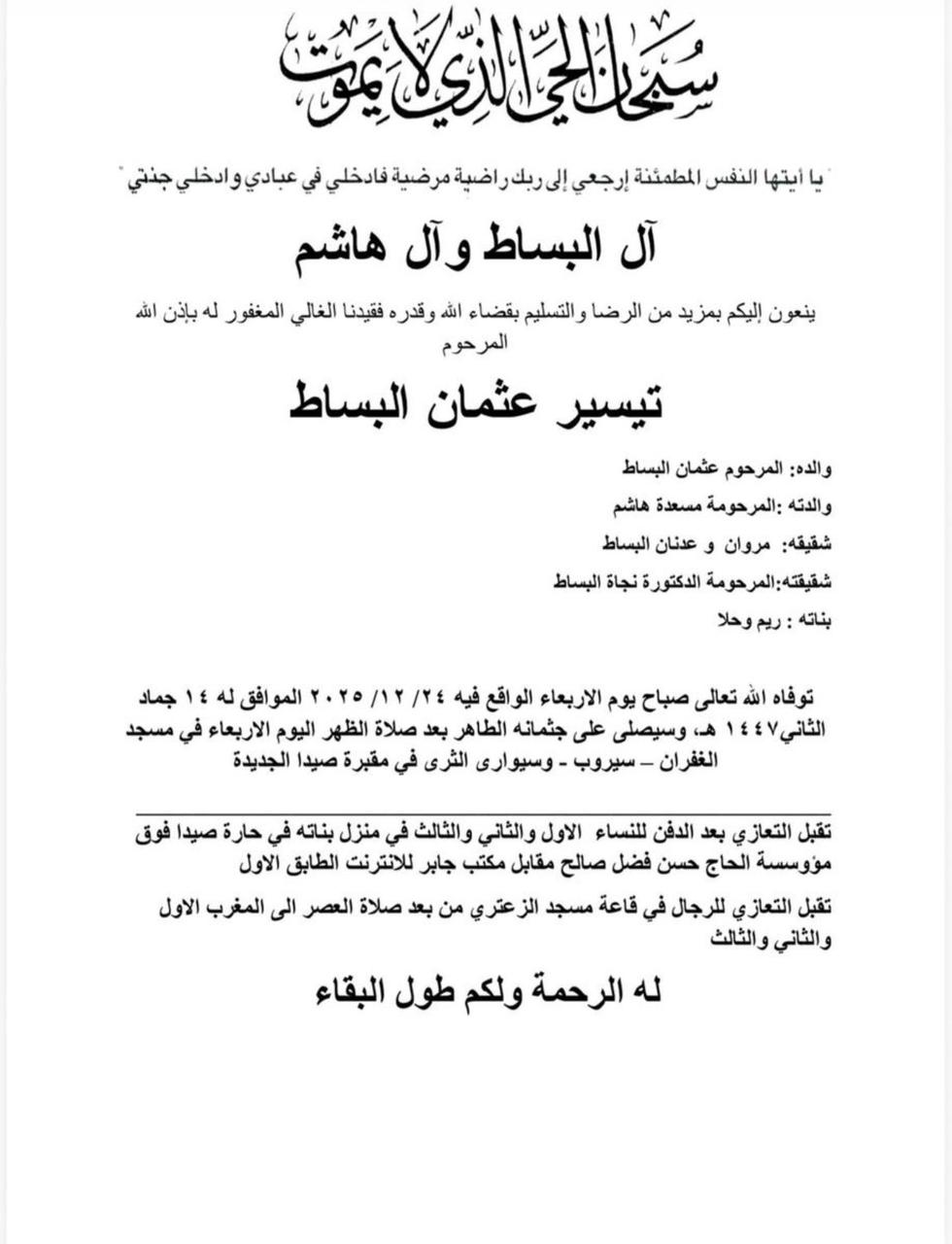 وفاة تيسير عثمان البساط، الدفن ظهر يوم الاربعاء في 24 كانون الاول 2025 الأربعاء 24/كانون الأول/2025 - 10:22 ص 12/24/2025 10:22:27 AM شارك
