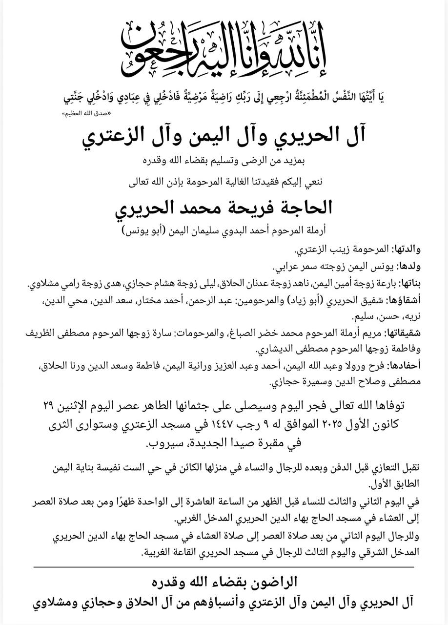 وفاة الحاجة فريحة محمد الحريري، الدفن عصر يوم الاثنين في 28 كانون الاول 2025 الإثنين 29/كانون الأول/2025 - 09:57 ص 12/29/2025 9:57:04 AM شارك