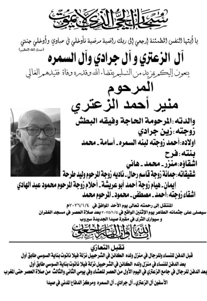وفاة منير احمد الزعتري، الدفن عصر يوم الاثنين في 5 كانون الثاني 2026 الإثنين 05/كانون الثاني/2026 - 10:01 ص 1/5/2026 10:01:38 AM شارك
