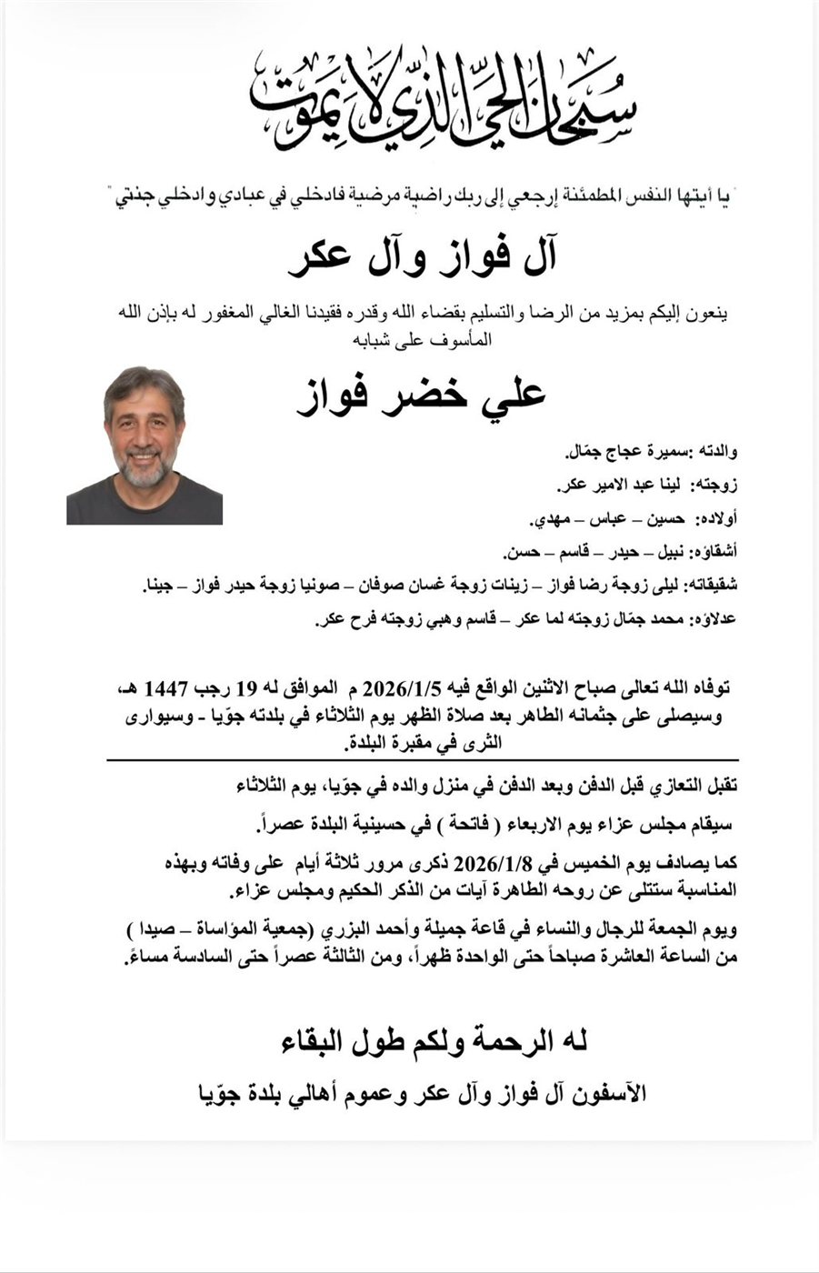 وفاة علي خضر فواز، الدفن ظهر يوم الثلاثاء في 6 كانون الثاني 2026 الإثنين 05/كانون الثاني/2026 - 01:27 م 1/5/2026 1:27:36 PM شارك