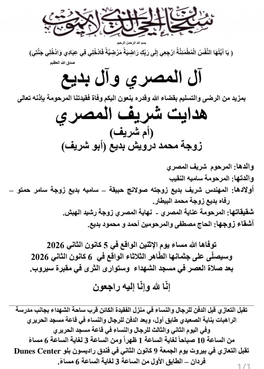 وفاة هدايت شريف المصري (ام شريف)، الدفن عصر يوم الثلاثاء في 6 كانون الثاني 2026 الإثنين 05/كانون الثاني/2026 - 10:53 م 1/5/2026 10:53:55 PM شارك