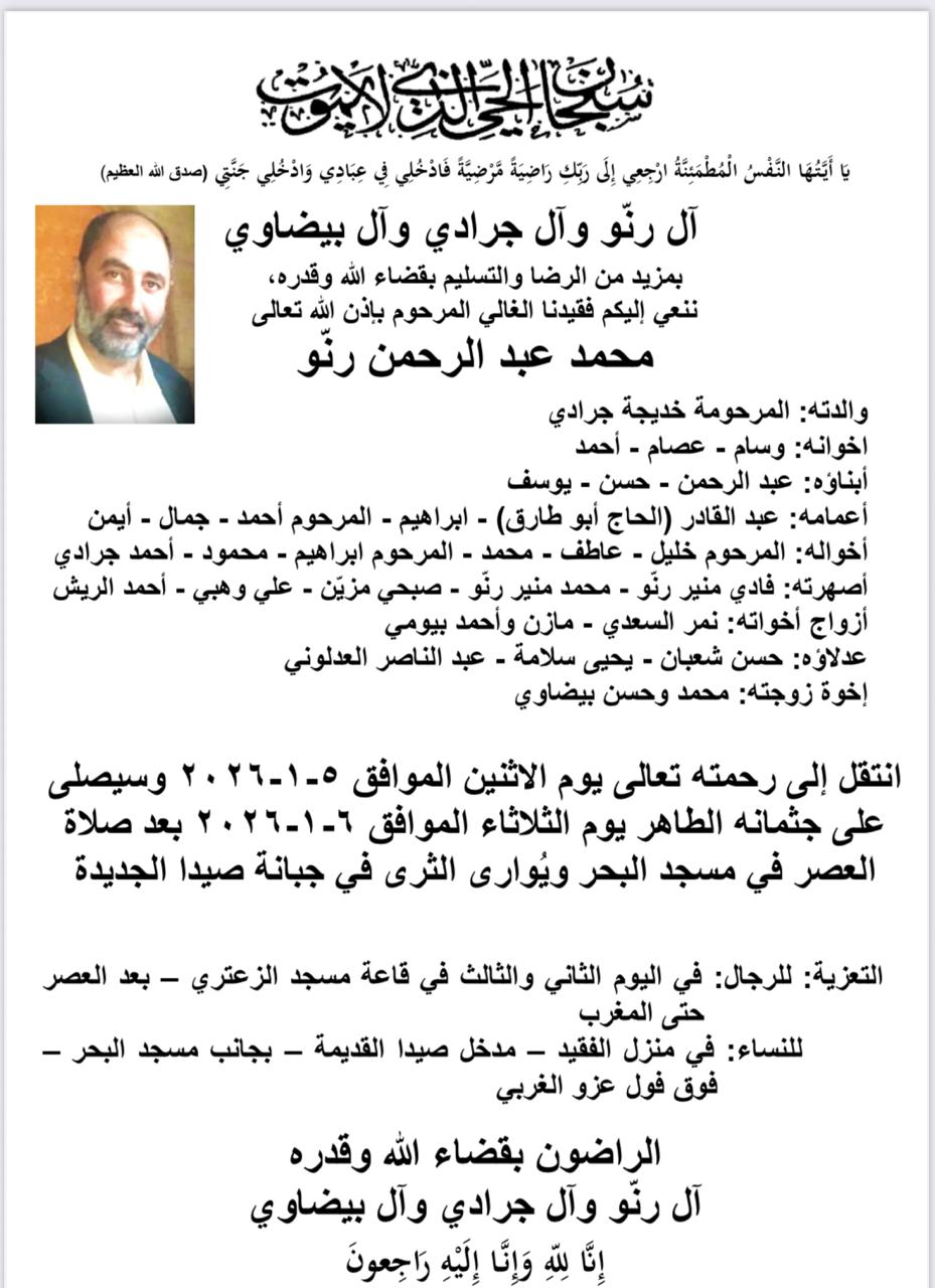 وفاة محمد عبد الرحمن رنو، الدفن عصر يوم الثلاثاء في 6 كانون الثاني 2026 الثلاثاء 06/كانون الثاني/2026 - 09:39 ص 1/6/2026 9:39:47 AM شارك