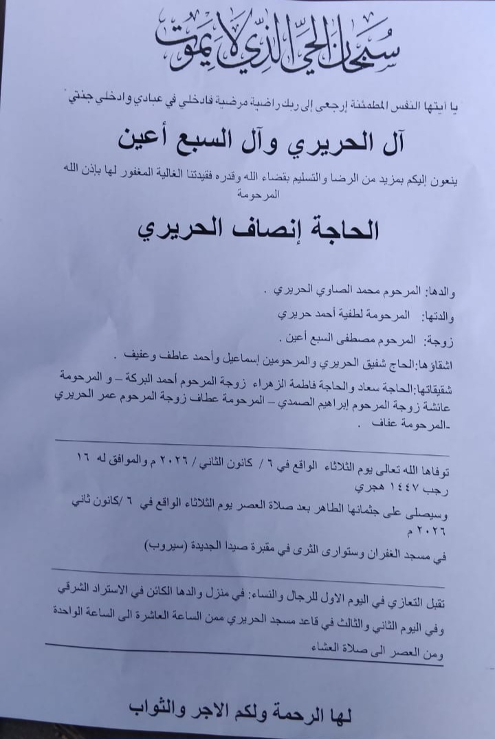 وفاة الحاجة انصاف الحريري، الدفن عصر يوم الثلاثاء في 6 كانون الثاني 2026 الثلاثاء 06/كانون الثاني/2026 - 02:28 م 1/6/2026 2:28:06 PM شارك