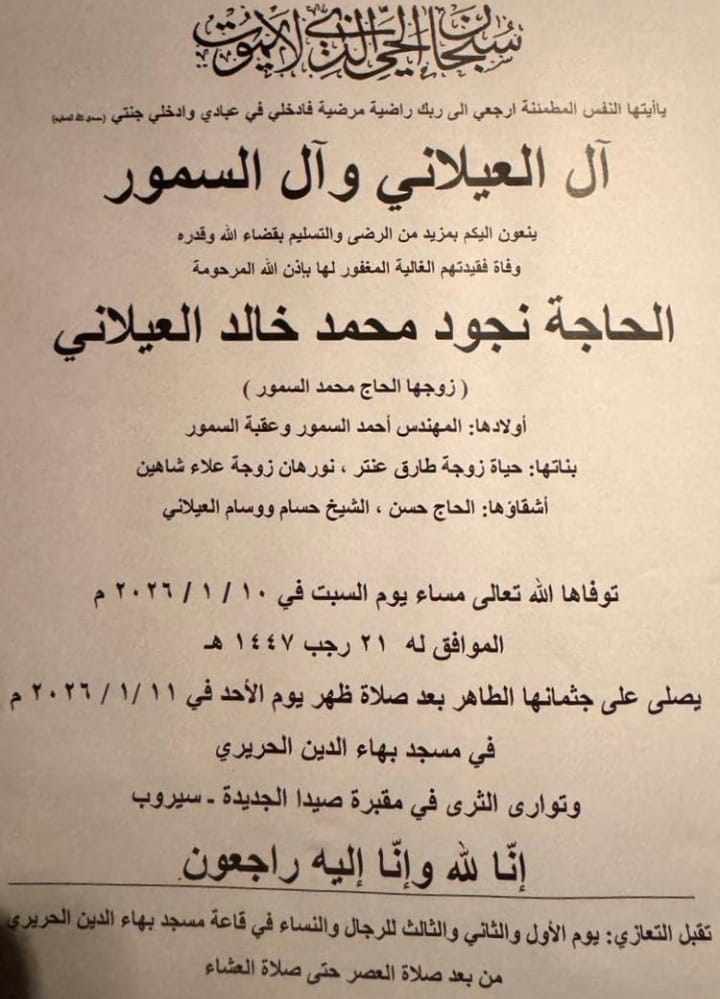 وفاة الحاجة نجود محمد خالد العيلاني، الدفن ظهر يوم الاحد 11 كانون الثاني 2026 الأحد 11/كانون الثاني/2026 - 12:07 ص 1/11/2026 12:07:04 AM شارك
