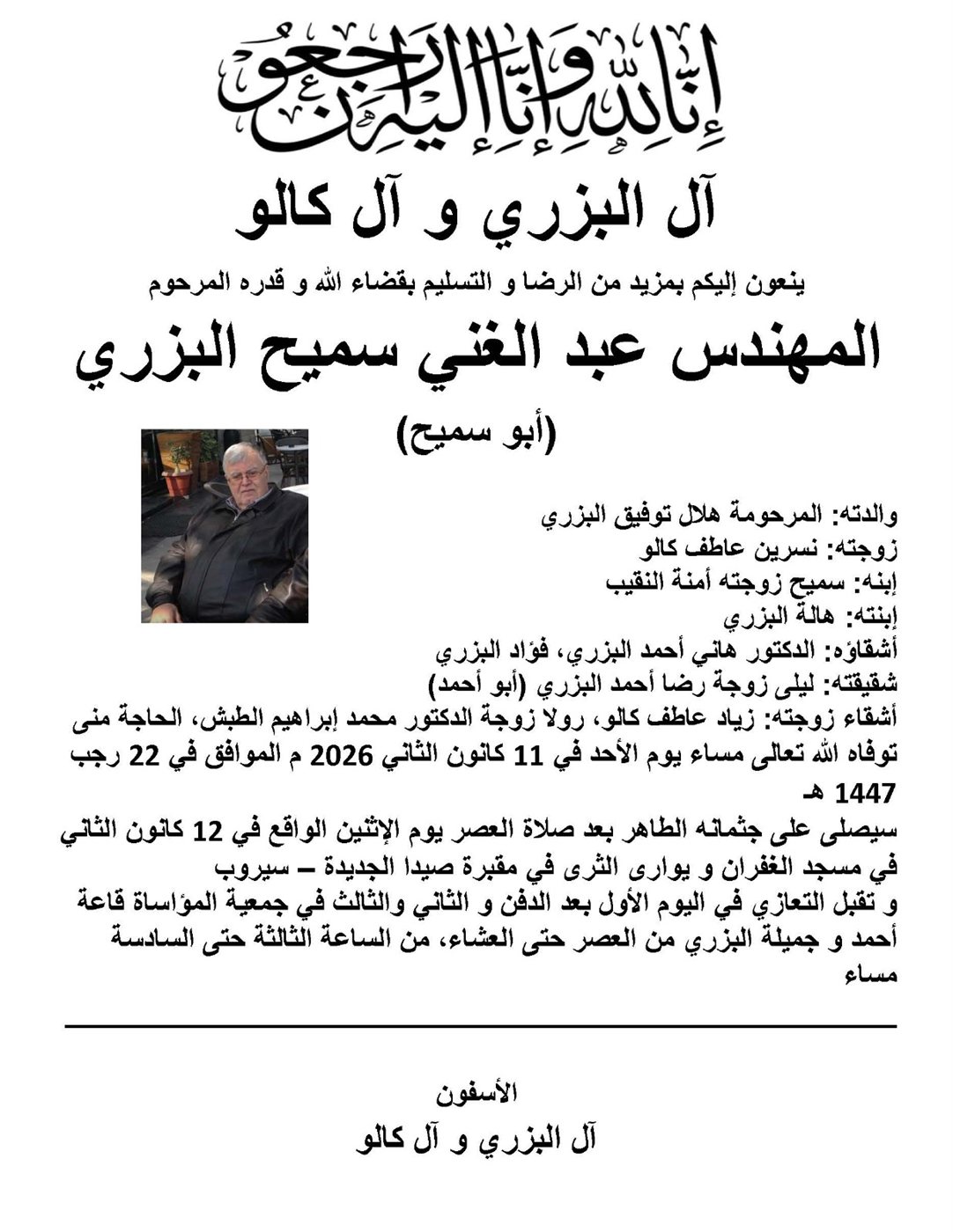 وفاة المهندس عبد الغني سميح البزري (ابو سميح)، الدفن عصر يوم الاثنين في 12 كانون الثاني 2026 الإثنين 12/كانون الثاني/2026 - 10:45 ص 1/12/2026 10:45:49 AM شارك