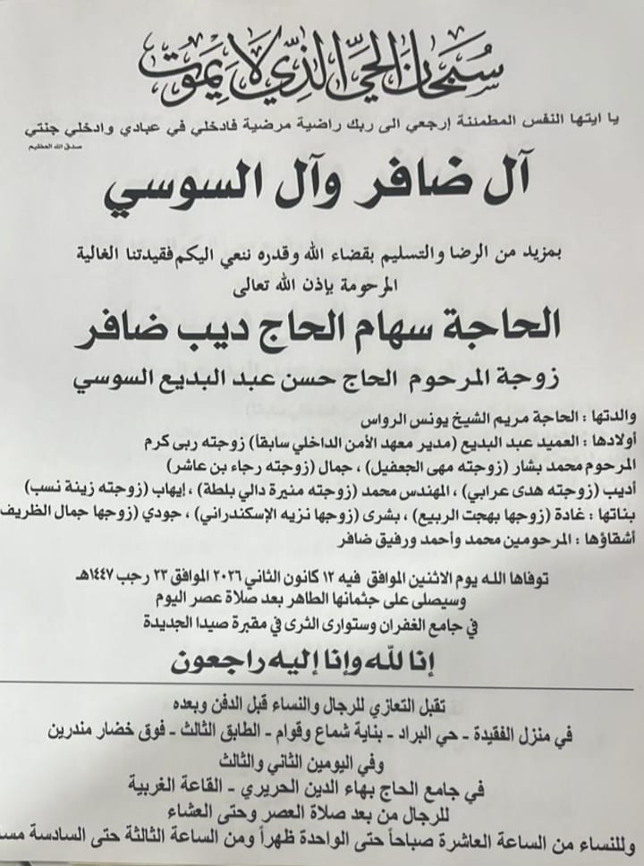 وفاة الحاجة سهام الحاج ديب ضافر، الدفن عصر يوم الاثنين في 12 كانون الثاني 2026 الإثنين 12/كانون الثاني/2026 - 10:47 ص 1/12/2026 10:47:31 AM شارك