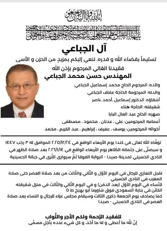 وفاة المهندس حسن محمد الجباعي، الدفن ظهر يوم الاربعاء في 14 كانون الثاني 2026 الثلاثاء 13/كانون الثاني/2026 - 10:52 ص 1/13/2026 10:52:36 AM شارك