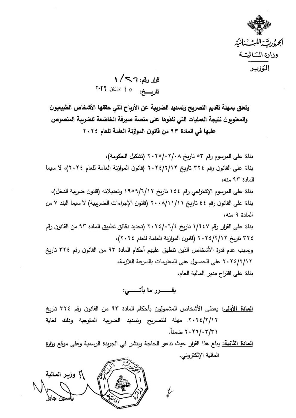 أصدر وزير المالية ياسين جابر، قرارًا مدّد بموجبه التصريح وتسديد الضريبة عن الأرباح التي حققها الأشخاص الطبيعيون والمعنويون نتيجة العمليات التي نفذوها على منصة صيرفة الخاضعة للضريبة المنصوص عليها في المادة 93 من قانون الموازنة العامة للعام 2024 لغاية تاريخ 31/3/2026 ضمنًا.