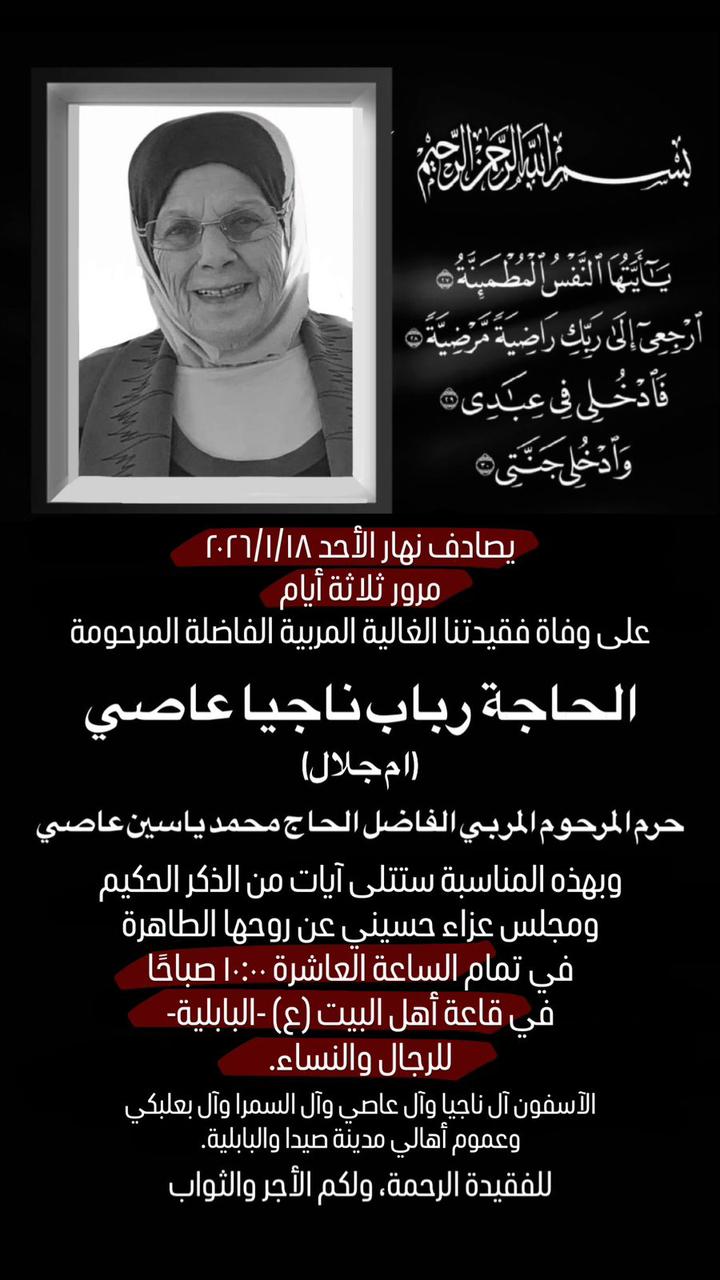 وفاة الحاجة رباب ناجيا عاصي (ام جلال)، ذكرى ثالث يصادف نهار الاحد في 18 كانون الثاني 2026 الجمعة 16/كانون الثاني/2026 - 04:17 م 1/16/2026 4:17:43 PM شارك