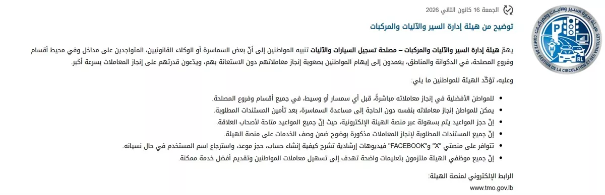 صدر عن هيئة إدارة السير والآليات والمركبات - مصلحة تسجيل السيارات والآليات، بيانٌ جاء فيه: "يهم الإدارة تنبيه المواطنين إلى أن بعض السماسرة أو الوكلاء القانونيين المتواجدين على مداخل وفي محيط أقسام وفروع المصلحة في الدكوانة والمناطق، يعمدون إلى إيهام المواطنين بصعوبة إنجاز معاملاتهم دون الاستعانة بهم، ويدعون قدرتهم على إنجاز المعاملات بسرعة أكبر.