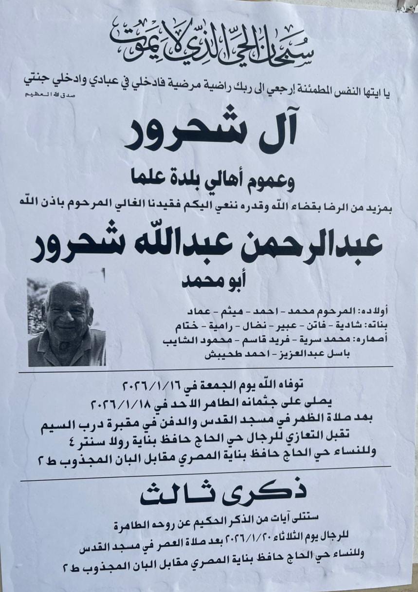وفاة عبدالرحمن عبدالله شحرور، الدفن ظهر يوم الاحد في 18 كانون الثاني 2026 الإثنين 19/كانون الثاني/2026 - 07:48 م 1/19/2026 7:48:45 PM شارك