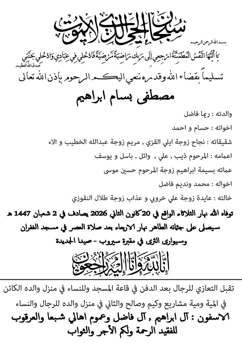وفاة مصطفى بسام ابراهيم، الدفن عصر يوم الاربعاء في 20 كانون الثاني 2026 الأربعاء 21/كانون الثاني/2026 - 09:19 ص 1/21/2026 9:19:19 AM شارك
