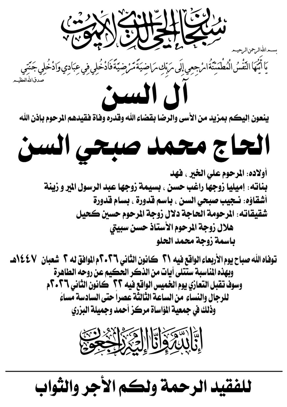 وفاة الحاج محمد صبحي السن، ذكرى ثالث الخميس 22 كانون الثاني 2026 الأربعاء 21/كانون الثاني/2026 - 08:18 م 1/21/2026 8:18:01 PM شارك