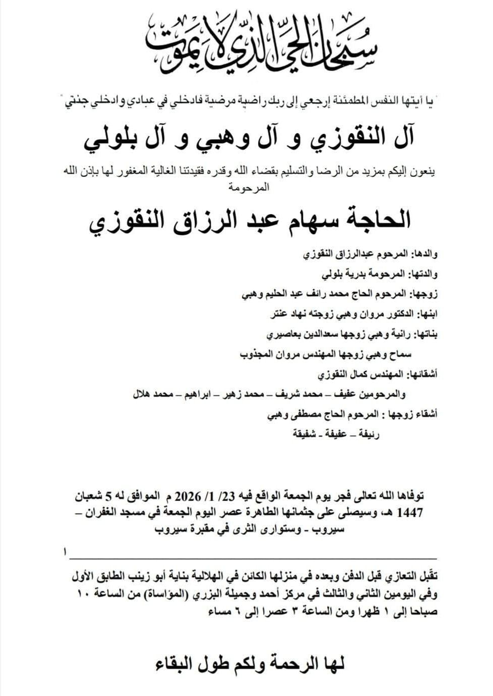 وفاة الحاجة سهام عبد الرزاق النقوزي، الدفن عصر يوم الجمعة في 23 كانون الثاني 2026 الجمعة 23/كانون الثاني/2026 - 11:18 ص 1/23/2026 11:18:59 AM شارك