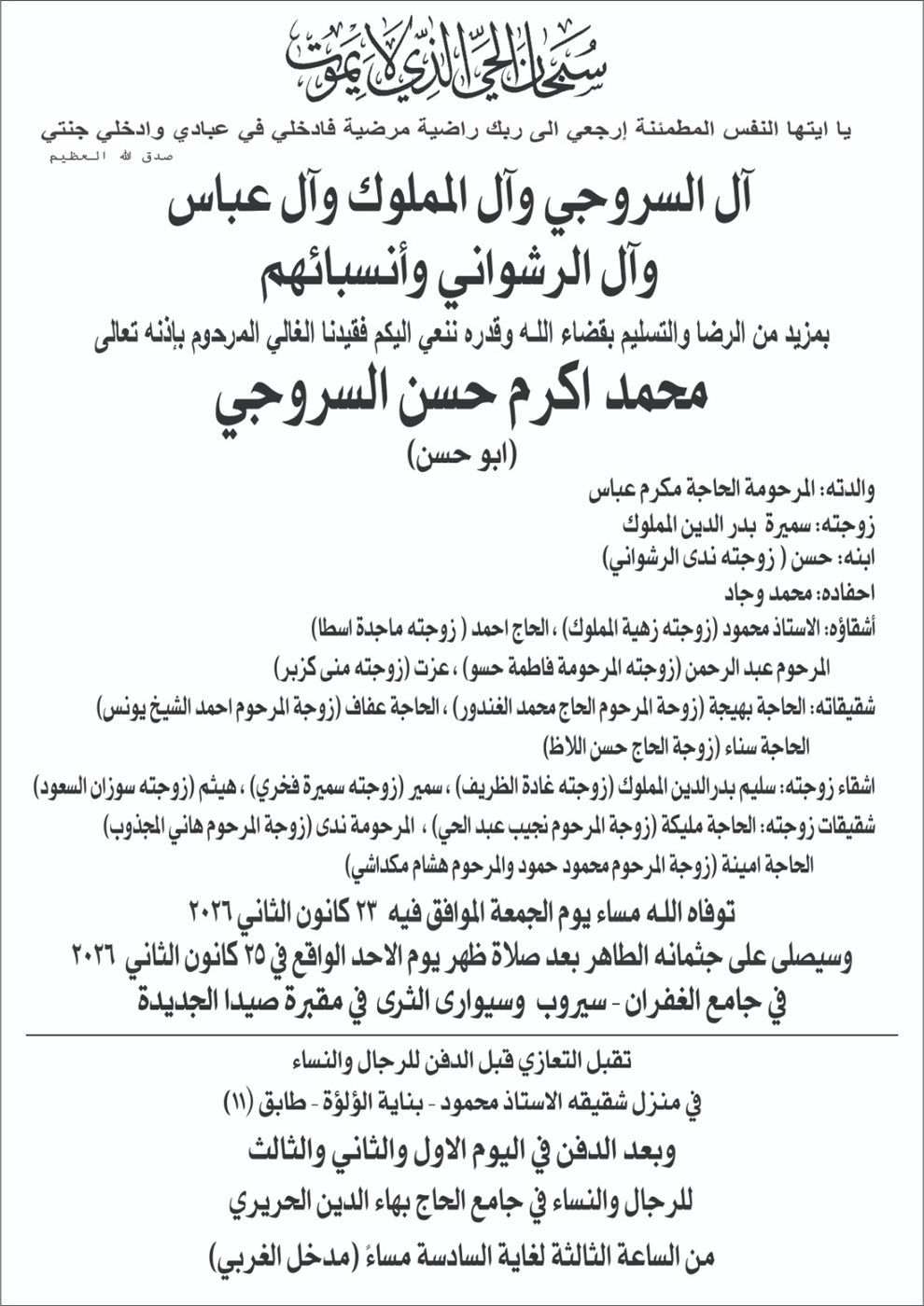 وفاة محمد اكرم حسن السروجي(ابو حسن)، الدفن ظهر يوم الاحد في 25 كانون الثاني 2026 السبت 24/كانون الثاني/2026 - 11:17 ص 1/24/2026 11:17:13 AM شارك