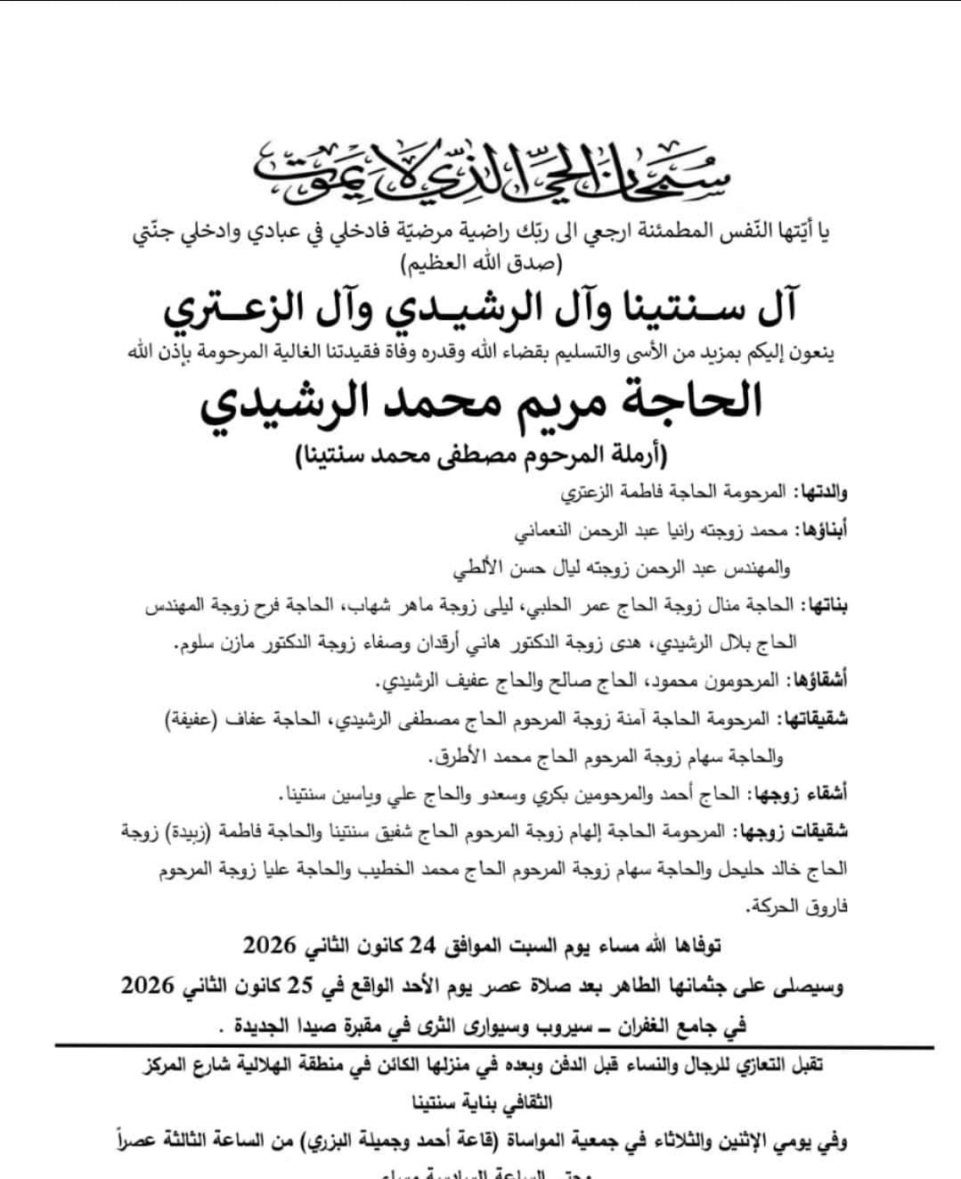 وفاة الحاجة مريم محمد الرشيدي، الدفن عصر يوم الاحد في 25 كانون الثاني 2026 الأحد 25/كانون الثاني/2026 - 02:35 ص 1/25/2026 2:35:38 AM شارك