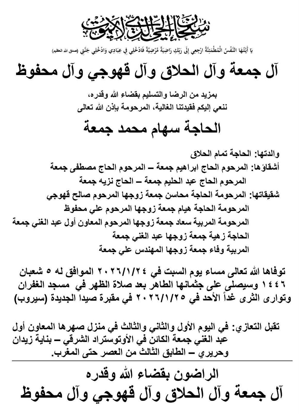 وفاة الحاجة سهام محمد جمعة، الدفن ظهر يوم الاحد في 25 كانون الثاني 2026 الأحد 25/كانون الثاني/2026 - 02:37 ص 1/25/2026 2:37:49 AM شارك