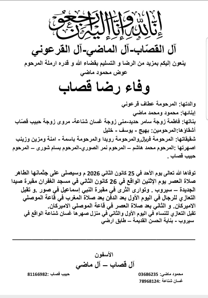 وفاة وفاء قصاب، الدفن عصر يوم الاثنين في 26 كانون الثاني 2026 الإثنين 26/كانون الثاني/2026 - 02:14 م 1/26/2026 2:14:27 PM شارك