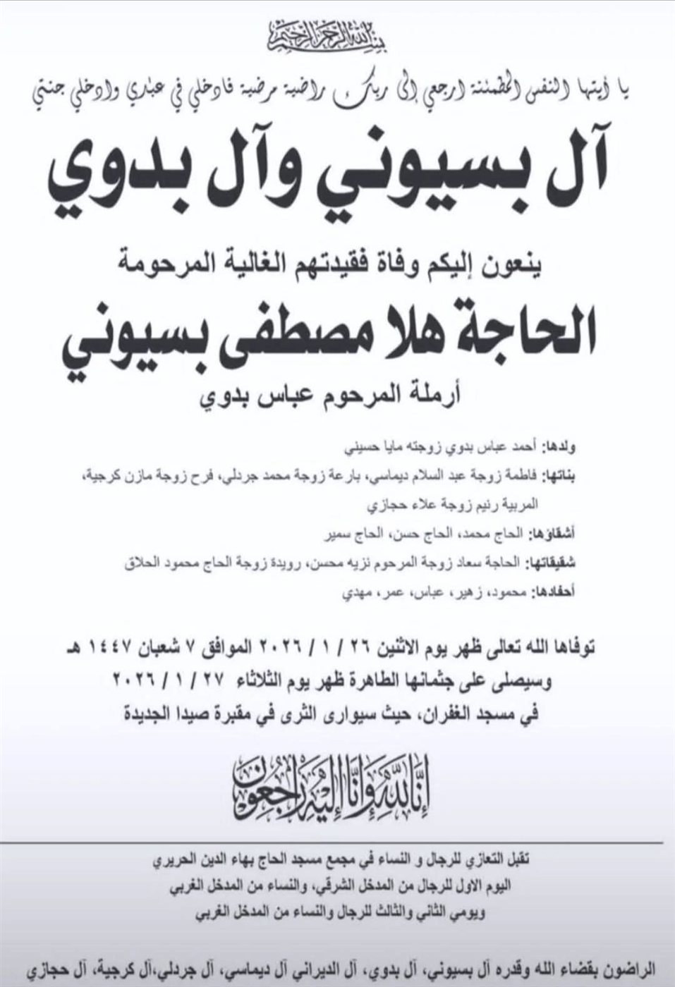 وفاة الحاجة هلا مصطفى بسيوني، الدفن ظهر يوم الثلاثاء في 27 كانون الثاني 2026 الإثنين 26/كانون الثاني/2026 - 06:58 م 1/26/2026 6:58:15 PM شارك