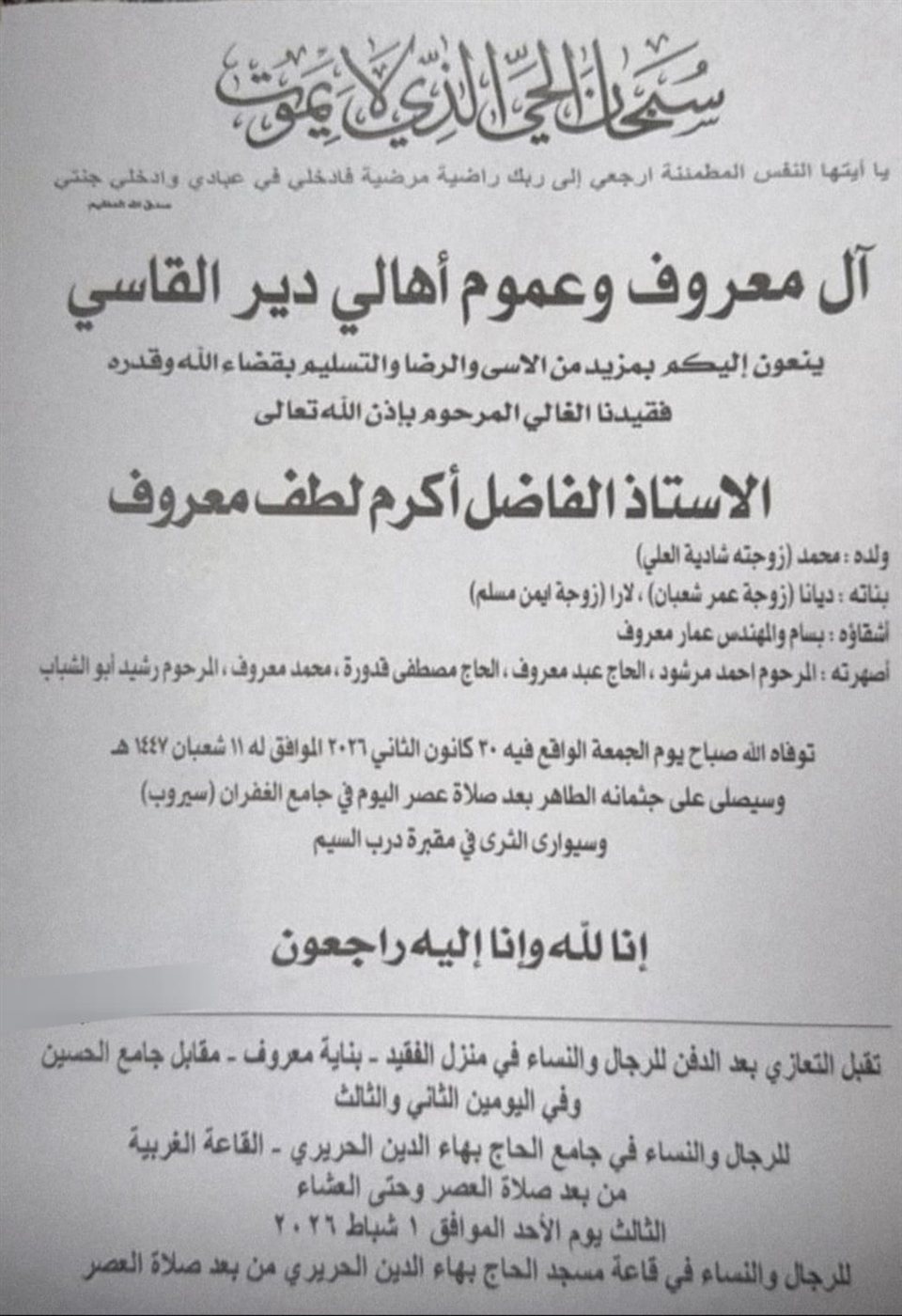 وفاة الاستاذ الفاضل اكرم لطف معروف، الدفن عصر يوم الجمعة في 30 كانون الثاني 2026 الجمعة 30/كانون الثاني/2026 - 02:59 م 1/30/2026 2:59:50 PM شارك