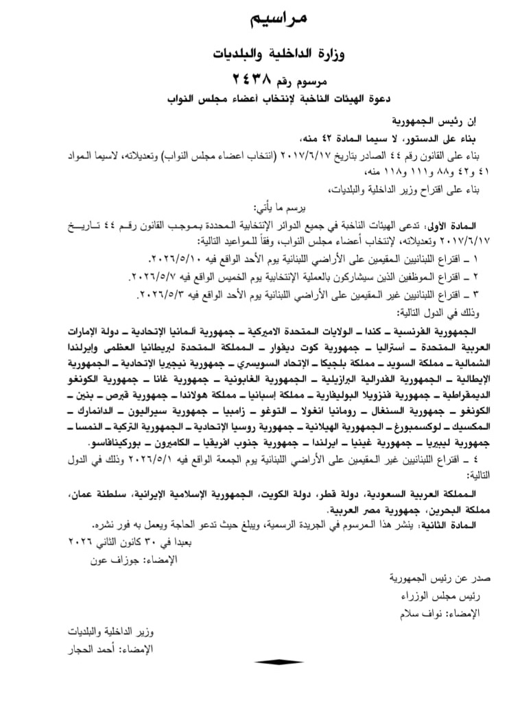صدور مرسوم دعوة الهيئات الناخبة في الجريدة الرسمية
