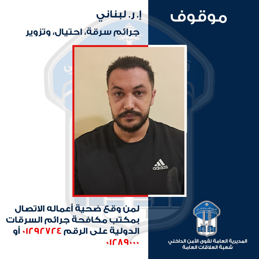 لذلك، وبناءً على إشارة القضاء المختص، تُعمِّم المديريّة العامّة لقوى الأمن الدّاخلي صورته، وتطلب من الذين وقعوا ضحيّة أعماله وتعرّفوا إليه، الحضور إلى مكتب مكافحة جرائم السّرقات الدّوليّة، الكائن في ثكنة العقيد الشّهيد جوزف ضاهر – بوليفار كميل شمعون، أو الاتّصال على أحد الرقمين: 292724-01 أو 289000-01، تمهيداً لاتخاذ الإجراءات القانونيّة اللّازمة