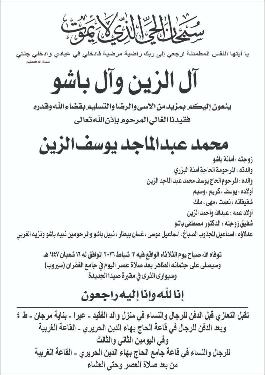 وفاة محمد عبدالماجد يوسف الزين، الدفن عصر يوم الثلاثاء في 3 شباط 2026 الثلاثاء 03/شباط/2026 - 10:45 ص 2/3/2026 10:45:38 AM شارك