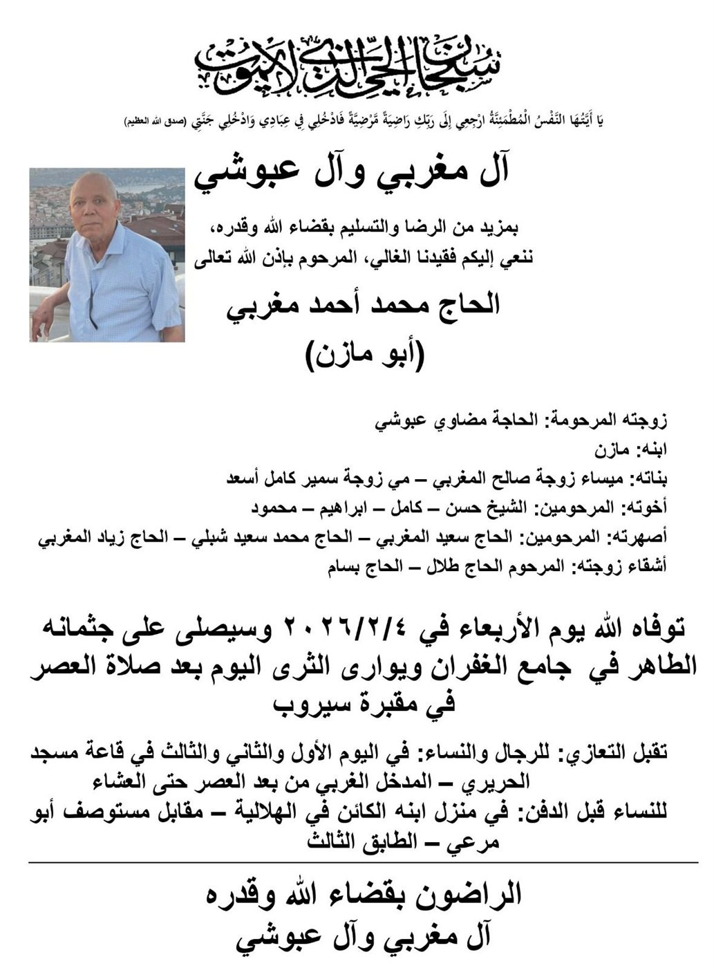 وفاة الحاج محمد احمد مغربي (ابو مازن)، الدفن عصر يوم الاربعاء في 4 كانون الثاني 2026 الأربعاء 04/شباط/2026 - 12:44 م 2/4/2026 12:44:13 PM شارك