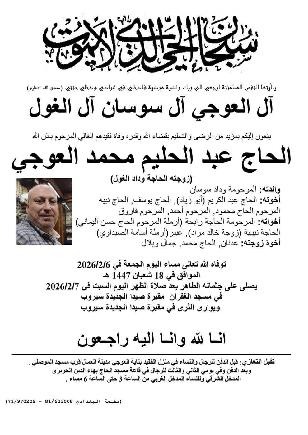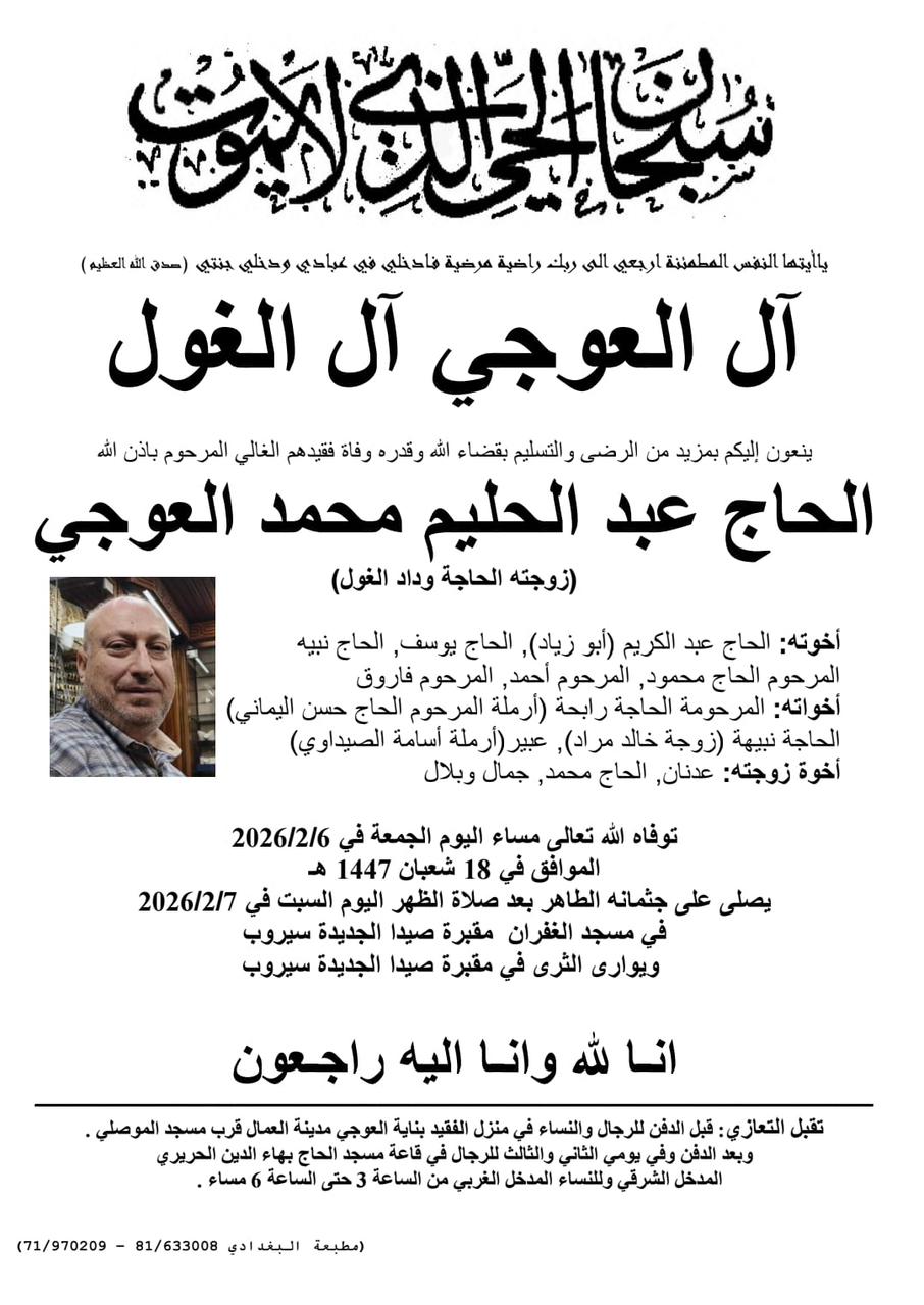 وفاة الحاج عبد الحليم محمد العوجي، الدفن ظهر يوم السبت في 7 شباط 2026 الجمعة 06/شباط/2026 - 10:57 م 2/6/2026 10:57:33 PM شارك