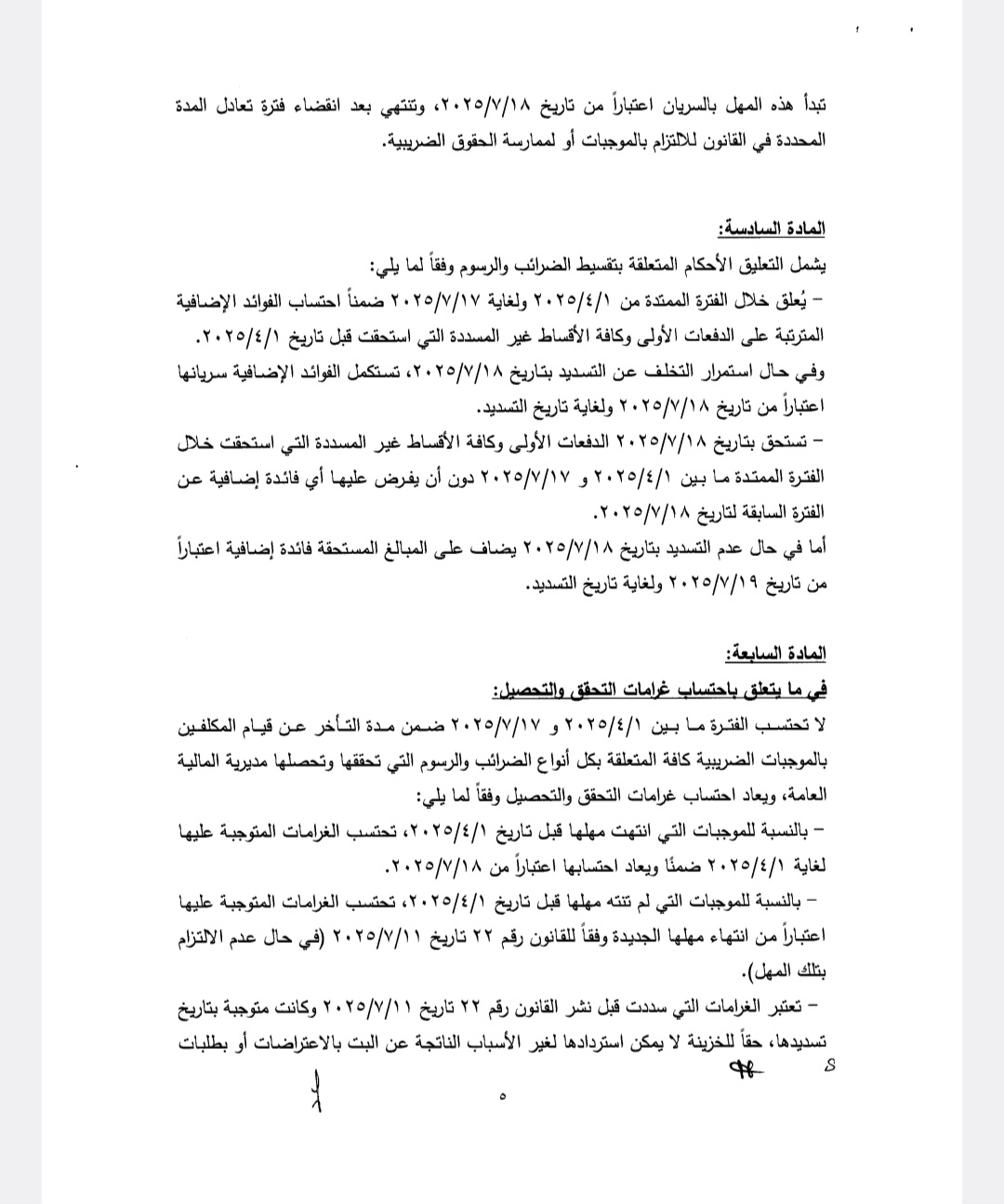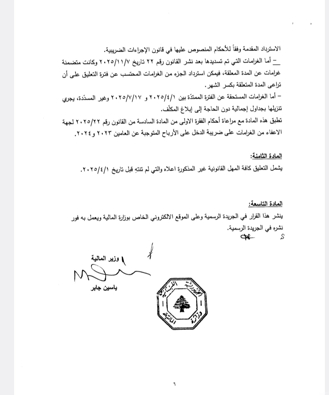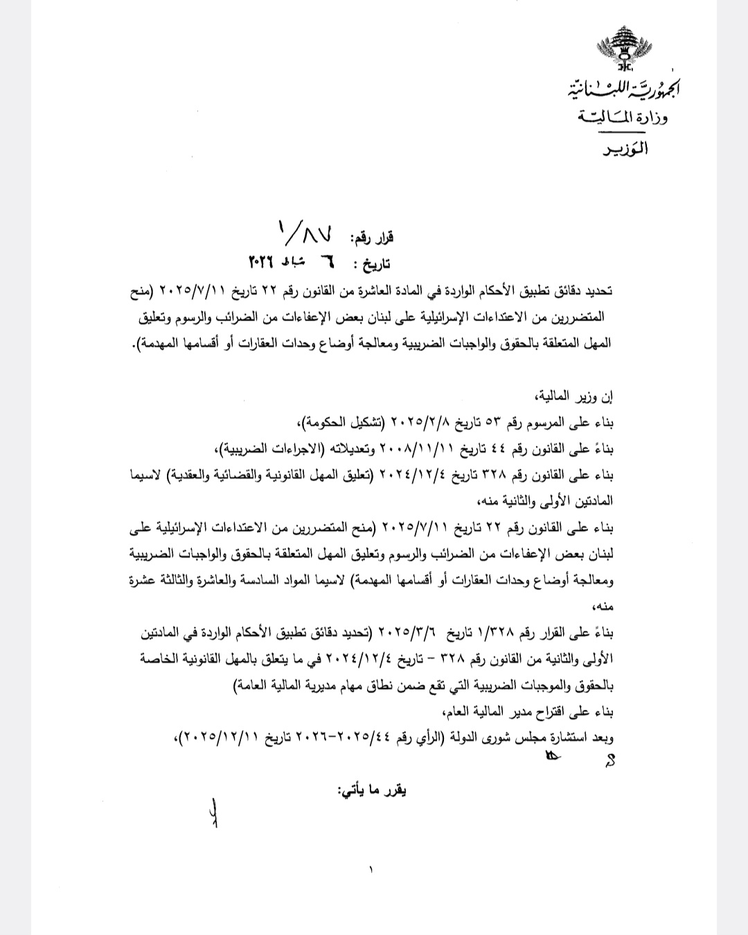 أصدر وزير المالية ياسين جابر قرارًا حدّد بموجبه آليات تطبيق الأحكام الواردة في المادة العاشرة من القانون رقم 22 تاريخ 11/7/2025، المتعلّق بمنح المتضرّرين من الاعتداءات الإسرائيلية على لبنان بعض الإعفاءات من الضرائب والرسوم، وتعليق المهل المرتبطة بالحقوق والواجبات الضريبية، إضافةً إلى معالجة أوضاع الوحدات العقارية أو أقسامها المهدّمة.
