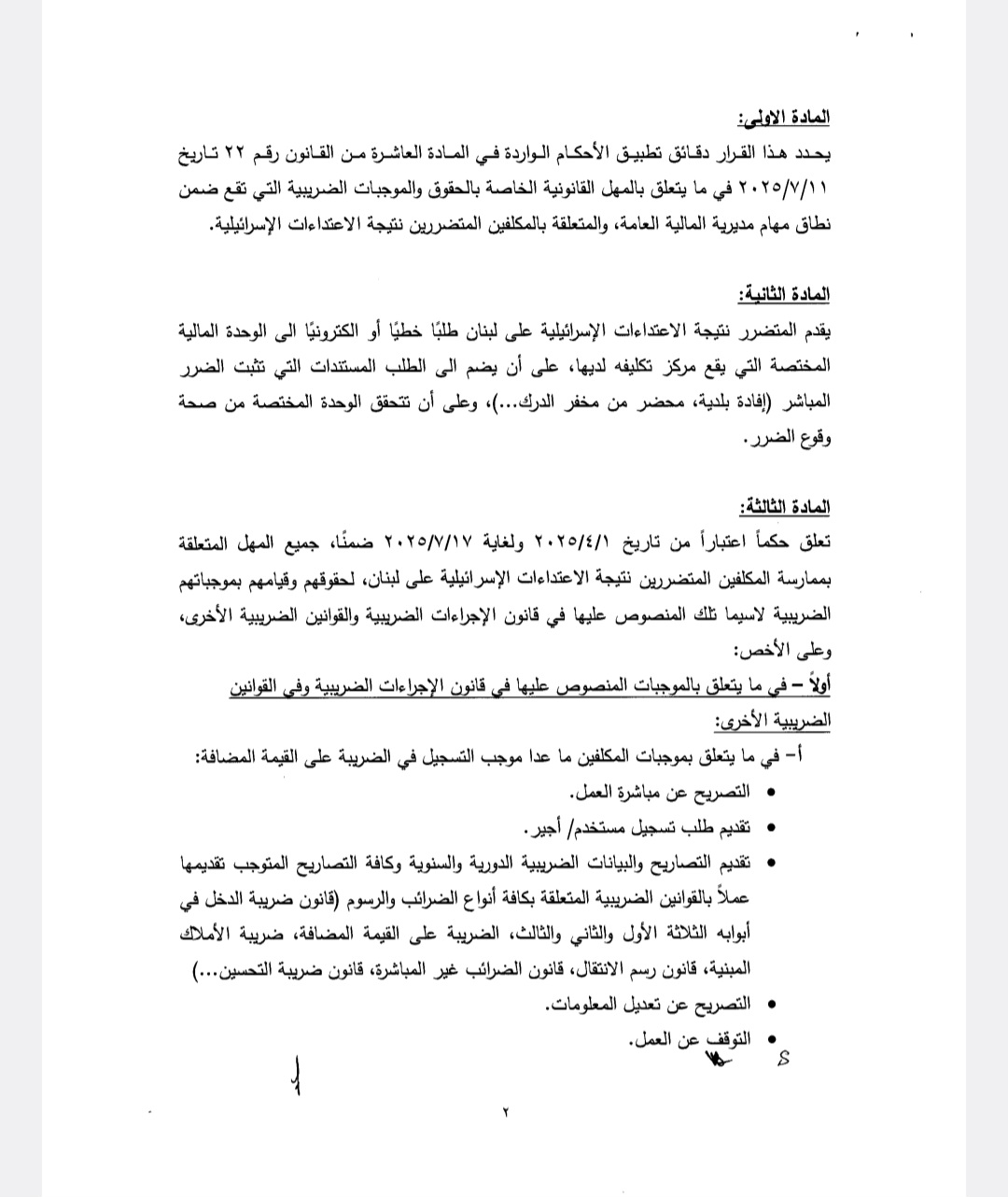 وزير المالية يحدّد آليات الإعفاءات الضريبية للمتضرّرين من الاعتداءات الإسرائيلية