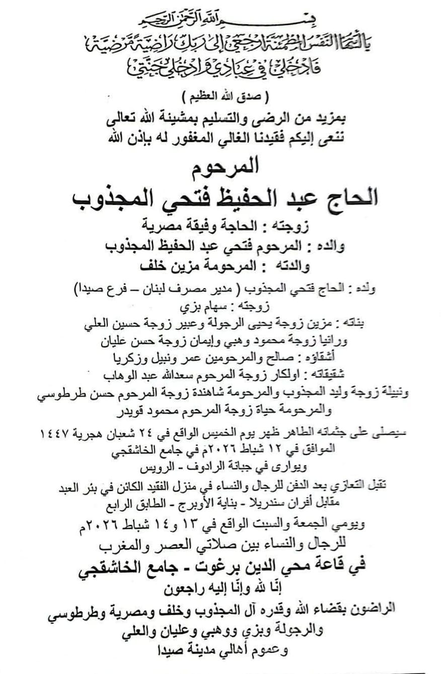 وفاة الحاج عبد الحفيظ فتحي المجذوب، الدفن ظهر يوم الخميس 12 شباط 2026 الأربعاء 11/شباط/2026 - 06:50 م 2/11/2026 6:50:41 PM شارك