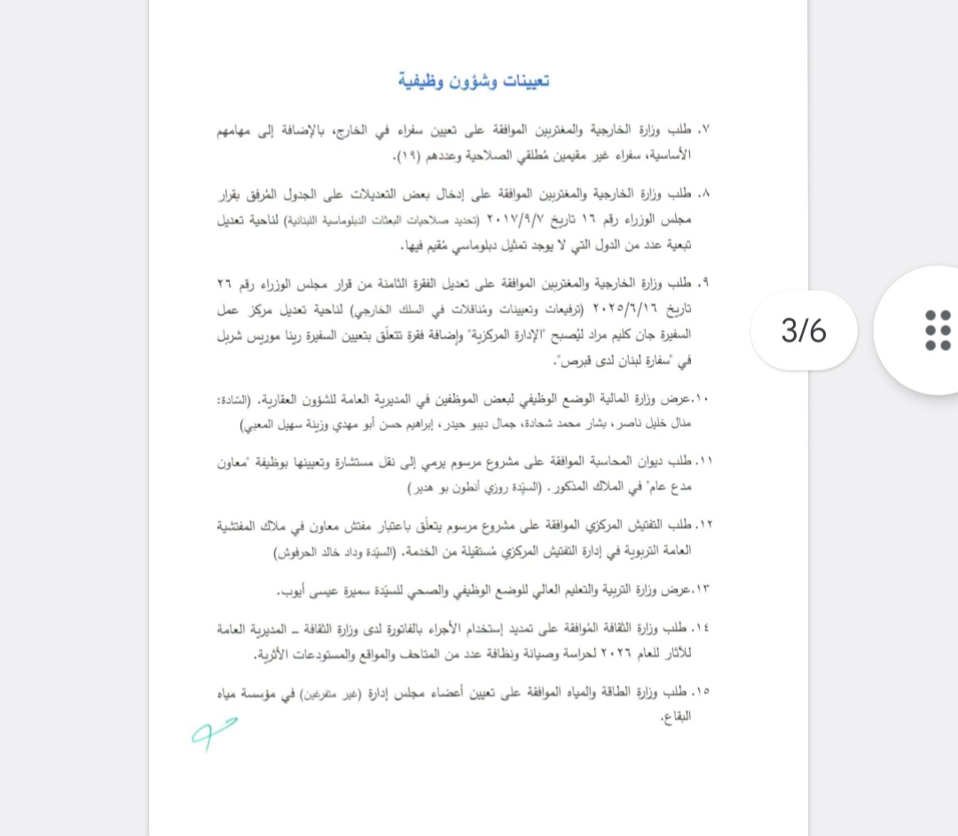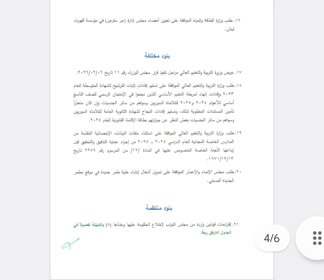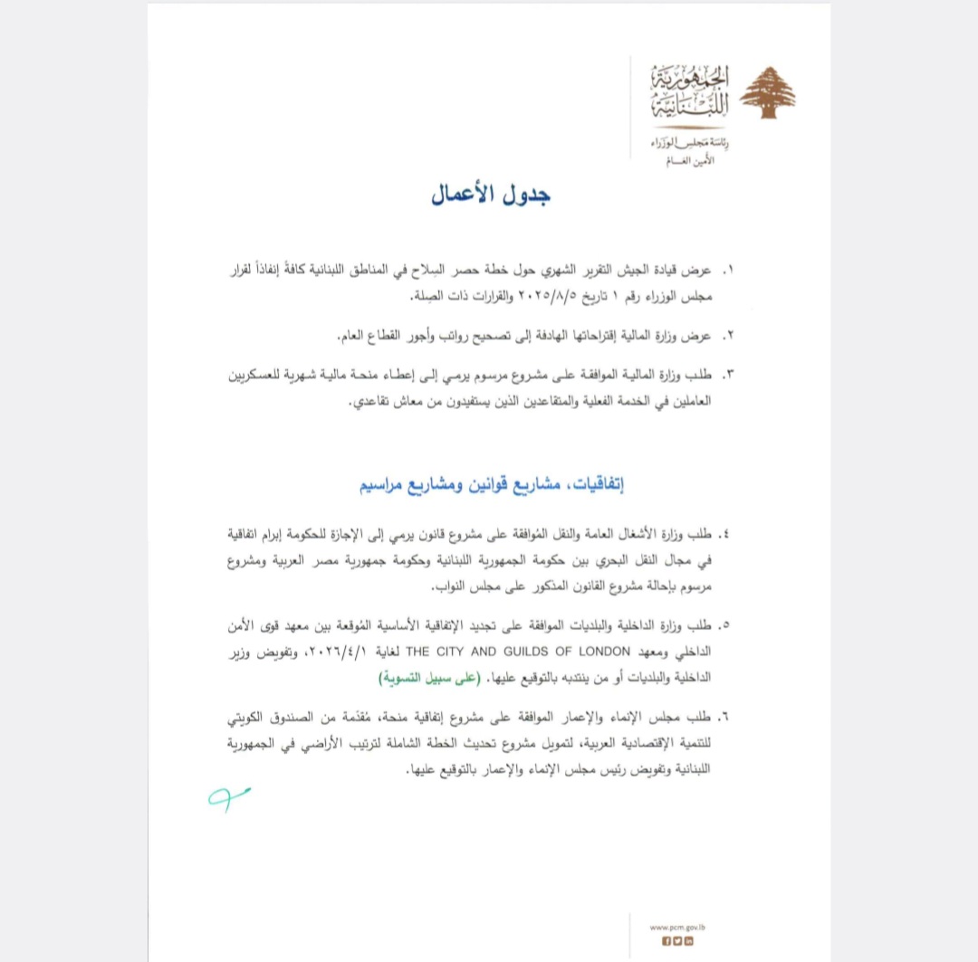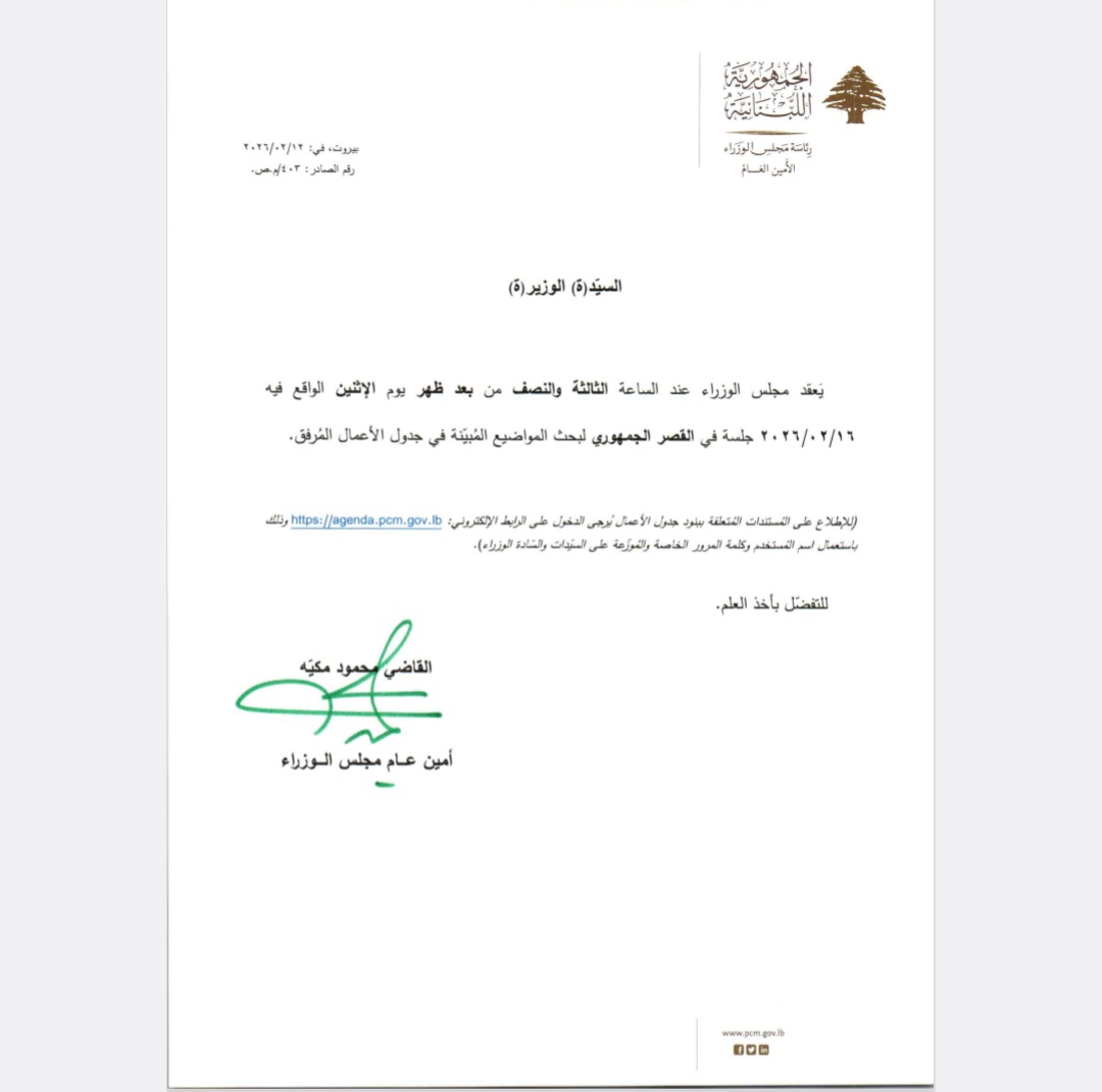يعقد مجلس الوزراء عند الساعة الثالثة والنصف من بعد ظهر يوم الإثنين الواقع فيه ٢٠٢٦/٠٢/١٦ جلسة في القصر الجمهوري لبحث المواضيع المبينة في جدول الأعمال المرفق.