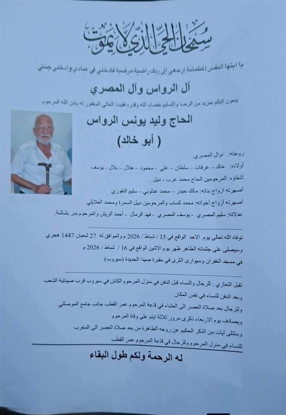 وفاة الحاج وليد يونس الرواس (ابو خالد)، الدفن ظهر يوم الاثنين في 16 شباط 2026 الإثنين 16/شباط/2026 - 07:18 ص 2/16/2026 7:18:14 AM شارك