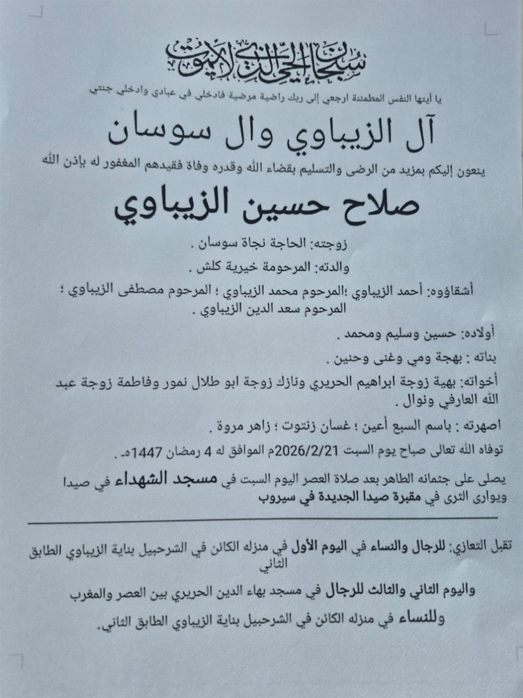 وفاة صلاح حسين زيباوي، الدفن عصر يوم السبت في 21 شباط 2026 السبت 21/شباط/2026 - 09:06 ص 2/21/2026 9:06:56 AM شارك