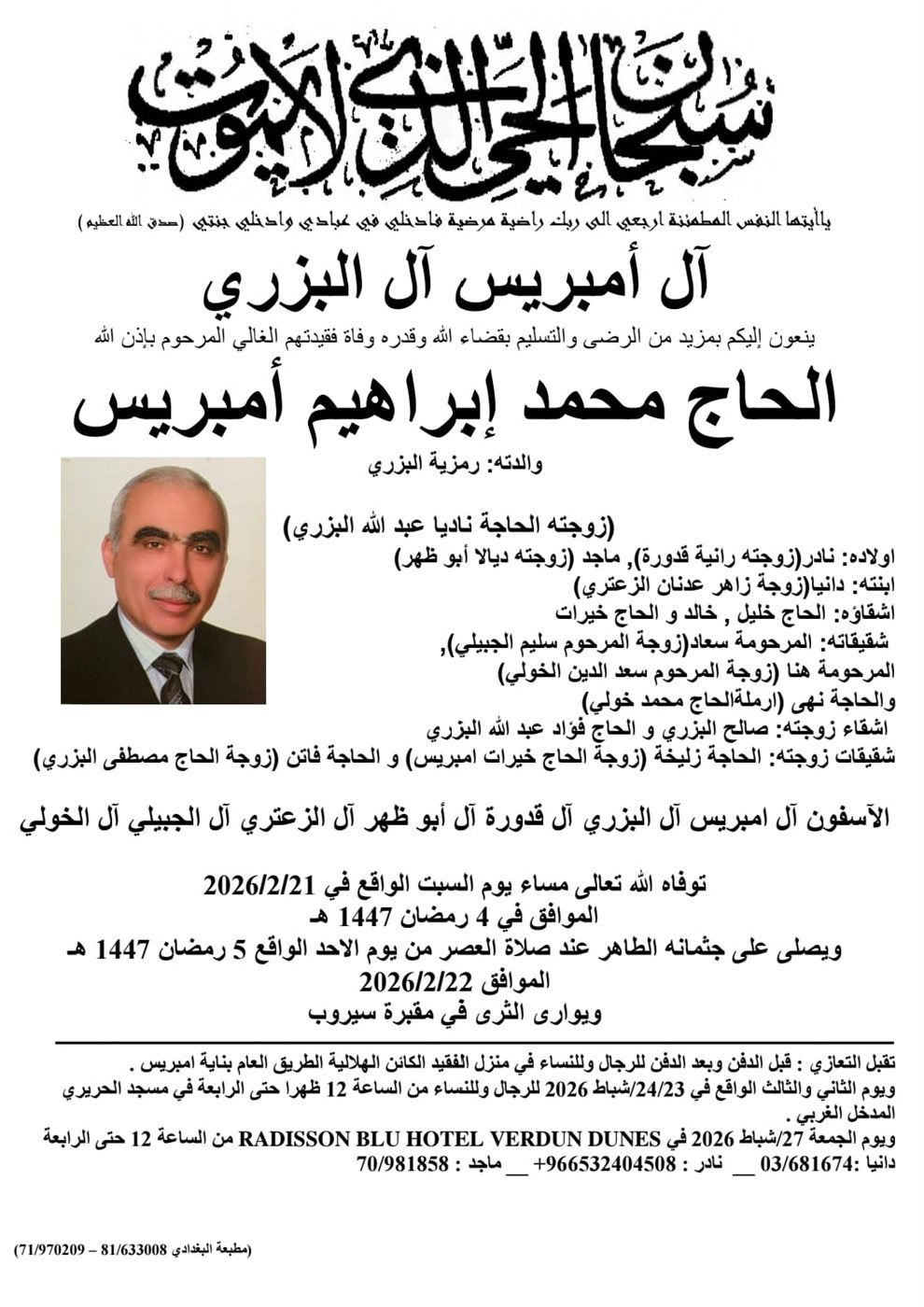 وفاة الحاج محمد ابراهيم أمبريس، الدفن عصر يوم الاحد 22 شباط 2026 السبت 21/شباط/2026 - 11:27 م 2/21/2026 11:27:19 PM شارك
